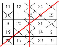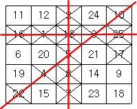 차례로 수를 지워가다가 같은 가로줄, 세로줄 또는 대각선 위에 있는 5개의 모든 수가 지워지는 경우 그 줄에 선을 긋는다.