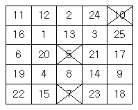 다음은 사회자가 부르는 수를 차례로 지워나간다. 예를 들어 5, 10, 7이 불렸다면 이 세 수를 지운 뒤 빙고판의 모습은 다음과 같다.