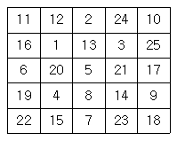 먼저 아래와 같이 25개의 칸으로 이루어진 빙고판에 1부터 25까지 자연수를 한 칸에 하나씩 쓴다