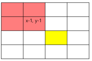 맨 왼쪽 맨 위로부터 노란색 칸 까지의 누적합을 구하기 위해서 (x, y-1) 까지 구해둔 합과 (x-1, y) 까지 구해둔 합을 활용한다. 두 칸까지 구해둔 누적합을 더하면 노란색 칸까지의 누적합을 구할 수 있다.