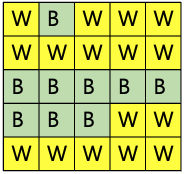 첫째 줄에는 전쟁터의 가로 크기 N, 세로 크기 M(1 ≤ N, M ≤ 100)이 주어진다. 그 다음 두 번째 줄에서 M+1번째 줄에는 각각 (X, Y)에 있는 병사들의 옷색이 띄어쓰기 없이 주어진다. 모든 자리에는 병사가 한 명 있다. B는 파란색, W는 흰색이다. 당신의 병사와 적국의 병사는 한 명 이상 존재한다.